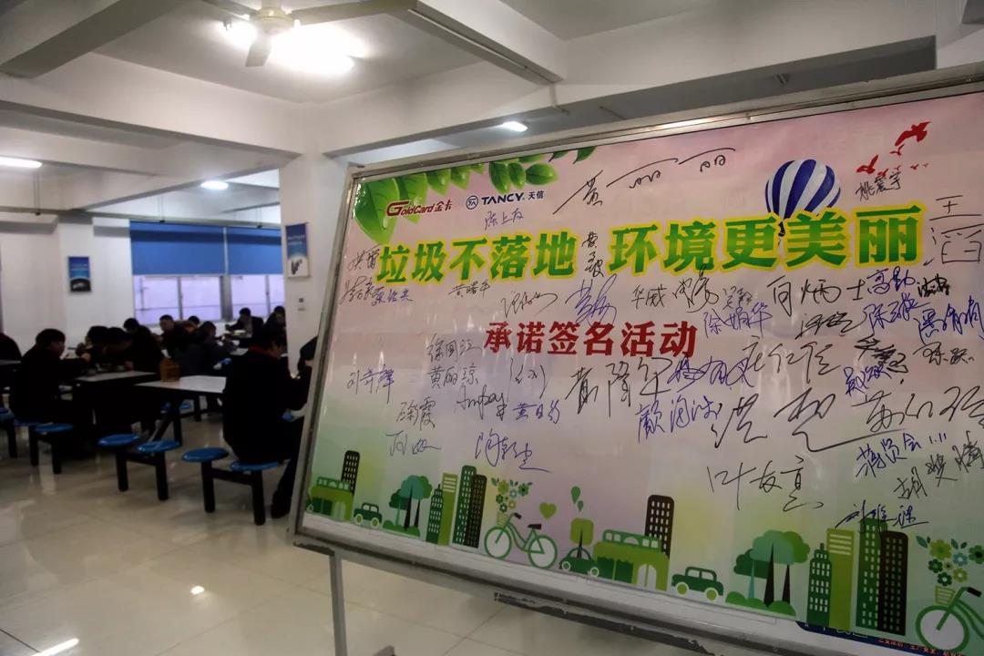 期間,天信黨委還利用午餐員工聚集的時間,組織員工在食堂進行了垃圾不落地、環境更美麗的全員承諾簽名活動。